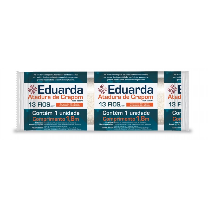 A Atadura Crepom 13 Fios – Eduarda é indicada para utilização em terapia compressiva. Aplicações ortopédicas como imobilizações e enfaixamentos, fixação de curativos, prevenção de contusões em atividades esportivas. As ataduras são confeccionadas em tecido de alta qualidade, conferindo ao produto grande elasticidade no sentido longitudinal. Sem desfiamento lateral, compressão uniforme, enfaixamento perfeito, elasticidade adequada, macia e isenta de fios soltos. Produto não é estéril, pode ser esterilizado em autoclave, óxido de etileno ou irradiação gama, produto de uso único.