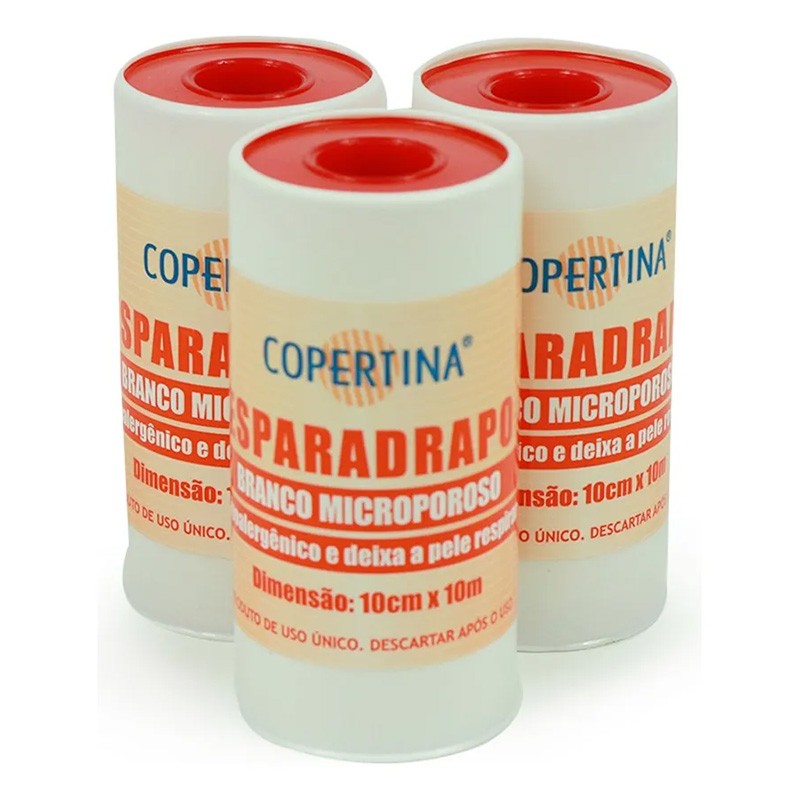 Fita Microporosa Copertina 10cm x 10 metros - Fita Micropore - Fita Microporosa - Esparadrapo Microporoso - Fita Cirúrgica Microporosa OBS: Ela não machuca a pele ao ser colada! O esparadrapo microporoso (fita micropore) é acondicionado em carretel de plástico (polipropileno) com tampa que se encaixa no carretel, vedando a embalagem. - Produto destinado à fixação de curativos e produtos médico-hospitalares. - É hipoalergênico e microporoso, deixando a pele respirar. Composição: - Falso Tecido à base de fibra de viscose e resina acrílica.