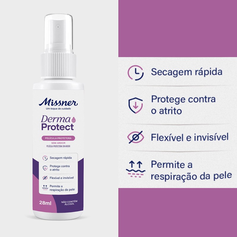 Spray Película Protetora Derma Protect é uma solução protetora sem odor, que cria um filme sobre a pele, prevenindo possíveis lesões ou agravamento das mesmas decorrentes de incontinências urinária e/ou fecal, ostomias, fricção ou atrito pelo uso constante de curativos.