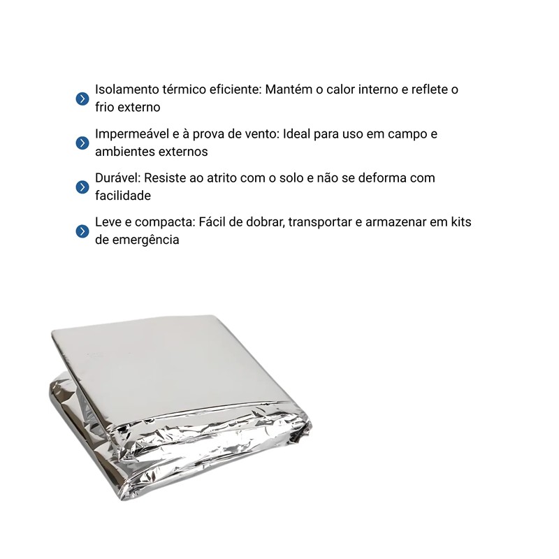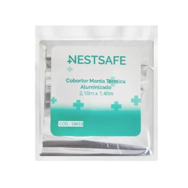 A manta térmica aluminizada NESTSAFE foi desenvolvida para oferecer isolamento térmico eficiente em situações de emergência. Produzida com material aluminizado de alto desempenho, reflete o calor do corpo e ajuda a manter a temperatura ideal, prevenindo o choque térmico. Mede 2,10 x 1,40 metros, garantindo ampla cobertura com formato leve e compacto que facilita o transporte e o uso.