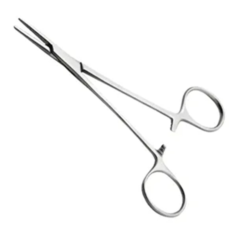 Instrumento cirúrgico utilizado para hemostasia, clampagem de vasos ou tecidos. Possui cremalheira para travamento progressivo e ponta reta, medindo 12,5cm.