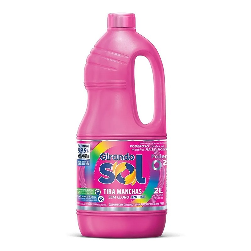 Tira Manchas Sem Cloro Girando Sol 2 Litros. Tira-manchas são coringas na hora da lavagem de roupas. Com múltiplo uso, eles removem manchas difíceis e preservam os tecidos. A fórmula sem cloro deixa o branco impecável sem danificar as outras cores. Imagina tirar manchas das suas roupas claras e escuras sem danificá-las ou desbotá-las? Com o Tira Manchas Sem Cloro da Girando Sol é possível chegar a esse objetivo, com um produto que tira as manchas mais difíceis! Apresentação: - Volume: 2 Litros; - Uso: Roupas brancas e coloridas; - Ação: Remove manchas difíceis como de gordura, café, vinho, e sujeiras em geral; - Segurança: Fórmula sem cloro, protege as cores dos tecidos. Indicação: - Utilizar o tira-manchas sem cloro traz diversos benefícios e alguns deles são: - Tira-manchas difíceis de peças coloridas: - Como citamos anteriormente, o tira-manchas sem cloro é capaz de tirar as manchas mais difíceis de peças coloridas, o que não é possível ser feito com produtos com cloro. Isso porque, o cloro desbota a cor das roupas coloridas. - Fácil de usar: - O tira manchas sem cloro é um produto extremamente fácil de utilizar, de modo que facilita o cuidado com as roupas no dia a dia. Modo de Uso: - Para tirar as manchas mais difíceis basta você adicionar um pouco de produto na região e deixar agir por alguns minutos. Depois esfregue a região manchada e leve para a máquina de lavar com Lava-Roupa Líquido e amaciante diluído. - Caso a mancha presente na sua roupa seja pequena e em diversas áreas, nós aconselhamos que você deixe a peça de molho em uma solução de água com 1 ou 2 tampinhas do tira-manchas, dependendo do tamanho da peça.