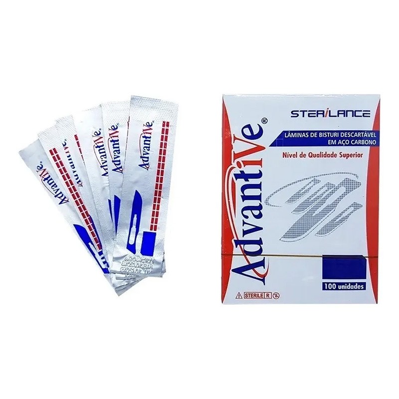 Lâmina Para Bisturi Advantive Estéril Características técnicas: - Confeccionadas em aço carbono - Esterilizadas por radiação de Cobalto - Grande resistência à corrosão e perda de afiação - Embaladas individualmente em material aluminizado - Mantêm-se estéreis preservando a integridade asséptica do produto - Apresentação: caixa com 100 unidades. Especificações técnicas: - Estéril por radiação de Cobalto - Uso único, destruir após o uso - Conservar em local arejado, protegida de fonte de luz ou calor - Grande resistência à corrosão e perda de afiação - Mantêm-se estéreis preservando a integridade asséptica do produto