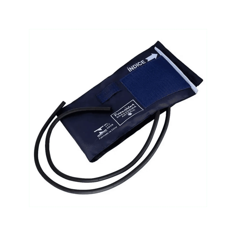 Posicione o manguito no braço nu, cerca de 2 cm acima da fossa cubital, centralizando o tubo sobre a artéria braquial. Ajuste o velcro de forma que fique firme, mas sem comprimir excessivamente. Conecte o manguito ao equipamento de medição e realize a aferição conforme orientação do fabricante do esfigmomanômetro.