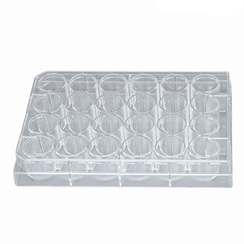 Microplaca estéril de poliestireno com 24 poços, otimizada para cultura celular em laboratórios de pesquisa.