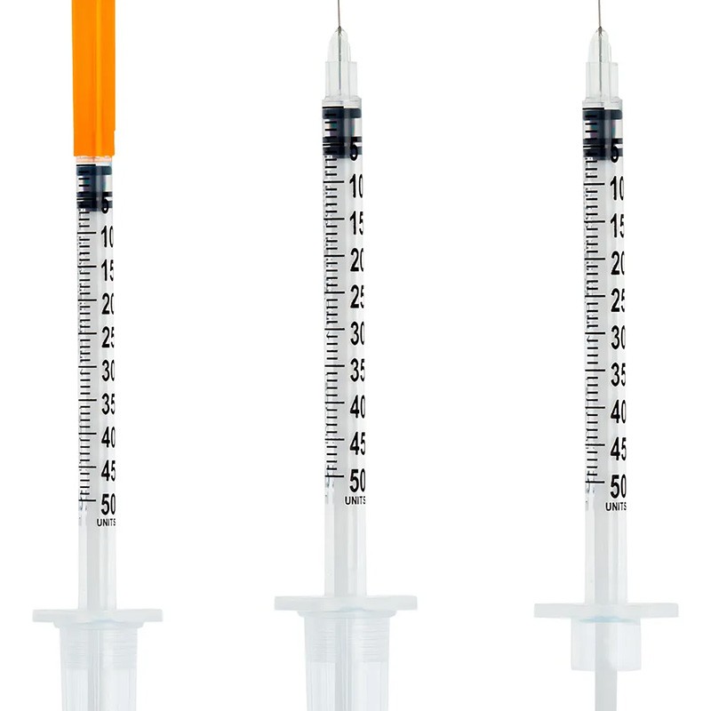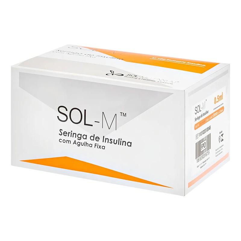 SERINGA DE INSULINA 0,5ML COM AGULHA FIXA 0,25MM X 6MM (31G) C/100 | SOL-M Podendo variar 0,25mm x 6mm / 31G ou 0,3mm x 8mm / 30G As injeções subcutâneas são feitas na primeira camada abaixo da pele, onde fica o tecido adiposo. Seringas com agulha fixa não têm espaço residual. É possível associar dois tipos de insulina na mesma seringa, algo comum na prática clínica. As agulhas são finas, com 6, 8 ou 13 mm de comprimento. Agulhas de menor comprimento são mais seguras, mais toleradas e confortáveis. O risco da insulina ser depositada no músculo, e não no tecido subcutâneo, aumenta progressivamente conforme o comprimento da agulha utilizada. Características 1. Escala nítida: 1 em 1 unidade, facilitando a aspiração de mini doses. 2. Ótima lubrificação do êmbolo: facilita a aspiração e ajuste da dose. 3. Cilindro da seringa transparente: permite visualização da integridade do medicamento aspirado. 4. Anel de Retenção: evita vazamentos e desperdício de medicações. 5. Comparada à uma seringa comum de 1ml, a Seringa de Insulina Sol-M economiza mais de 0,06 ml por injeção. 6. Sem espaço morto: evita perda de medicamento.