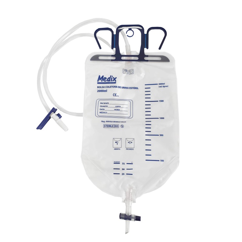 A Bolsa Coletora de Urina Sistema Fechado Medix Brasil é transparente, graduada, em PVC, embalada individualmente, esterilizada por Óxido de Etileno e tem capacidade de 2000ml.