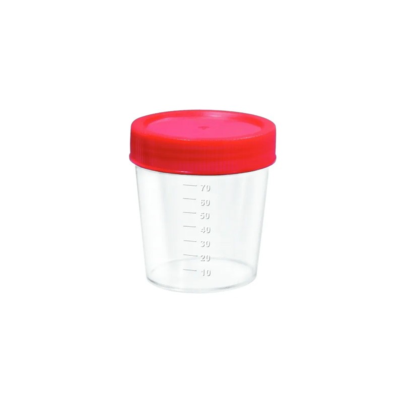 Coletor universal estéril para amostras biológicas. Fabricado em polipropileno transparente com capacidade para 80ml. Ideal para coleta de urina, fezes, escarro e sêmen em laboratórios e clínicas.